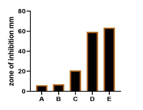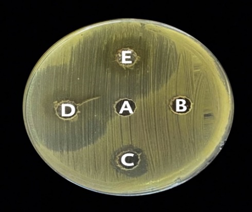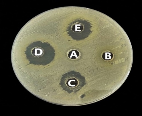 Figure 3. Antibacterial activity of I.suffruticosa against S. aureus. A, control. B, 62.5 microgram/ml. C, 125 microgram/ml. D, 250 microgram/ml. E, 500 microgram/ml. |