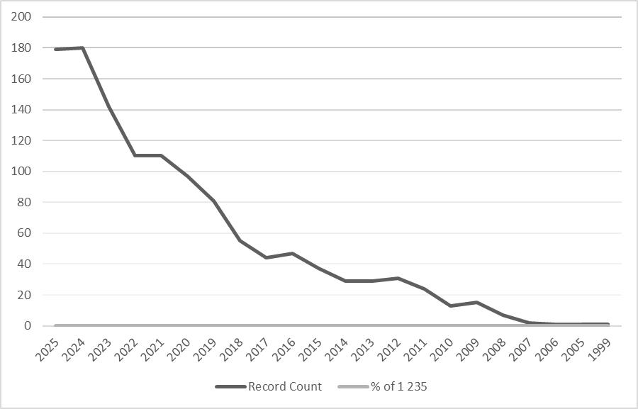 The period from 2020 to 2025 is distinguished by the intensification of research activity: the cumulative share of publications constitutes 70.664% of the total corpus (873 works out of 1,235). Such growth is conditioned by several factors: accelerated digitalisation of education in the context of the COVID-19 pandemic, increased accessibility of neurotechnological solutions, and government initiatives for modernisation of pedagogical education.