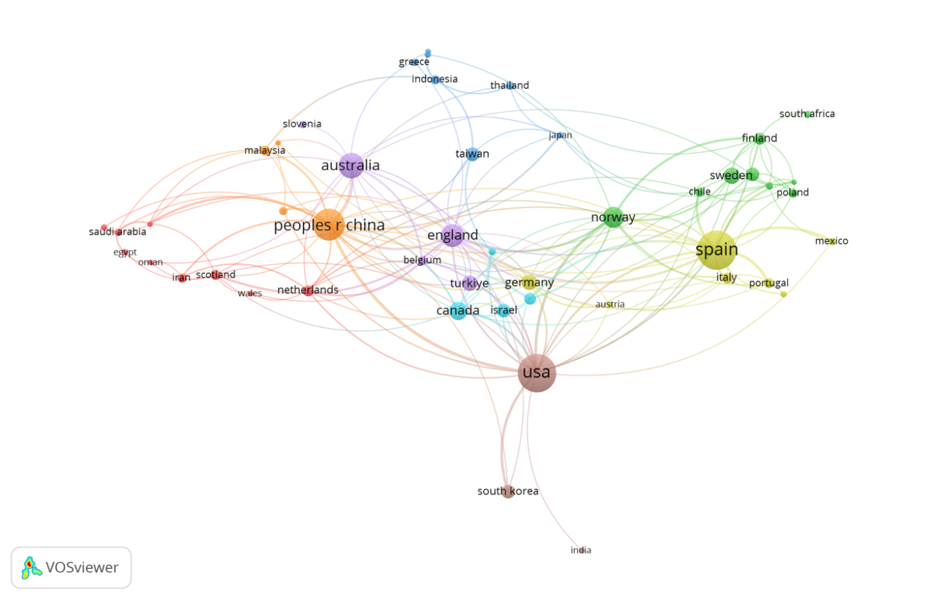The architecture of international collaboration demonstrates the absence of rigid geographical binding, indicating the global nature of research. Cluster formation is determined by the interaction of technological capabilities, economic interests, cultural-linguistic connections, and institutional frameworks. The central position of the USA, China, Spain, and Australia reflects their role as coordinating centers of global research initiatives in the field of digital culture formation among educators based on neurotechnologies.