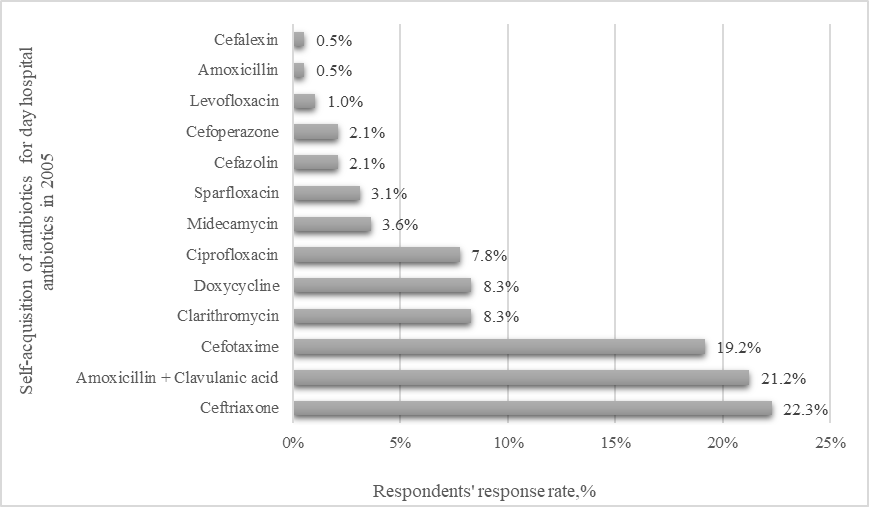 The high frequency of Ceftriaxone use, including in 2025, can be explained by the increase in resistance to the 1-2 generation of cephalosporins. Most AMPs, which were purchased in 2005 in a day hospital, are tablet/capsulated, therefore they can be used at the outpatient stage of therapy, without the need for hospitalization. The high frequency of patients self-purchasing carbapenems and glycopeptides in 2005 proves the lack of funding and insufficient purchase of broad-spectrum antibiotics/reserve in 2005 for hospitals. In 2025, patients could not remember the names of the drugs, but in general, AMPs were purchased less often than 20 years ago. Treatment of the primary diseases during hospitalization at the expense of the Federal Compulsory Medical Insurance Fund explains the shift in therapeutic group ratings towards correcting base therapy side effects.