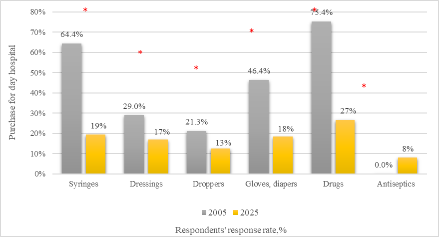 The high frequency of self-acquisition of antimicrobial drugs, both for a day hospital and for hospitalization, can be explained by the prevalence of bacterial diseases, including as a complication of the main disease. The situation is aggravated by the risk of nosocomial infections in the hospital. The acquisition of microcirculants, cardiovascular, and neurological drugs is natural based on the structure of the incidence of the population. In 2025, the decrease in their independent acquisition for a round-the-clock hospital can be explained by the distribution of beds by profile, as well as by the purchase of drugs in the hospital in accordance with the requirements of regulations.