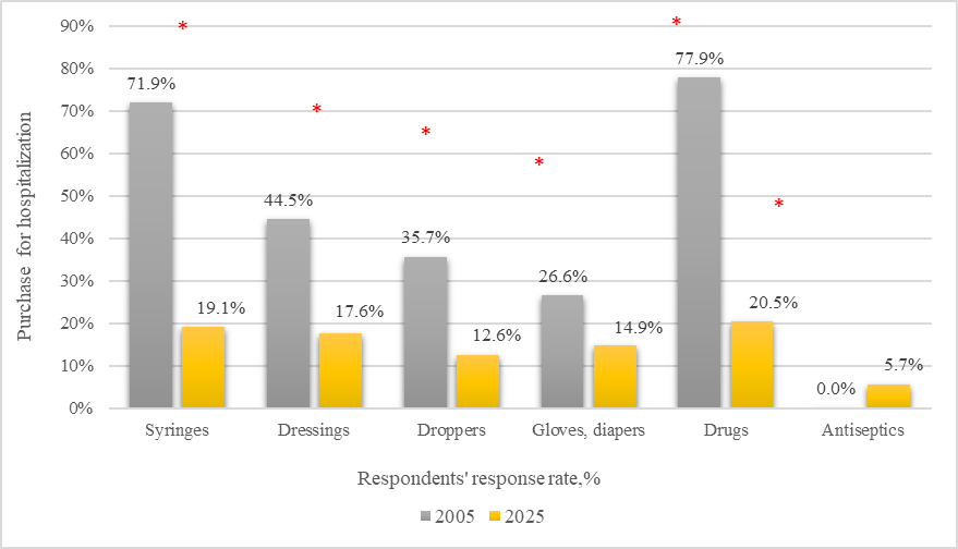 The survey was conducted based on the Federal State Educational Institution of Higher Education, Far Eastern State Medical University of the Ministry of Health of the Russian Federation. In 2005, paper-based questionnaires were used. A sociological survey was conducted in 2025 using the Google form (URL https://www.google.ru/intx/ru/forms/about/). Links were sent with the consent of the respondent. The questionnaire consisted of questions to identify the characteristics of the respondent (gender, age, education, availability of benefits), assessment of the availability of medical care (time of appointment with a doctor, service, prescribed number of drugs, recipe design), the completeness of providing the treatment process in medical organizations (self-purchase of medical products).
