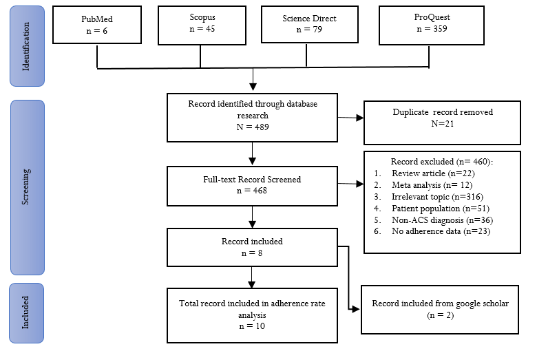 The research design used is a systematic review of the Preferred Reporting Items for Systematic Reviews and Meta-analyses (PRISMA) [11]. A comprehensive literature search was performed across multiple databases, including PubMed, Scopus, Science Direct, and ProQuest. The search methodology employs keywords derived from the research inquiry and Boolean operators (AND, OR, NOT, AND NOT). The search query consists of the following terms: "Acute Coronary Syndrome" or ACS, "Percutaneous Coronary Intervention" or PCI, "Dual Antiplatelet Therapy" or DAPT, and “Cessation" or Medical Adherence" or "Compliance." The present systematic study utilizes secondary data from journals, textbooks, and scientific articles.