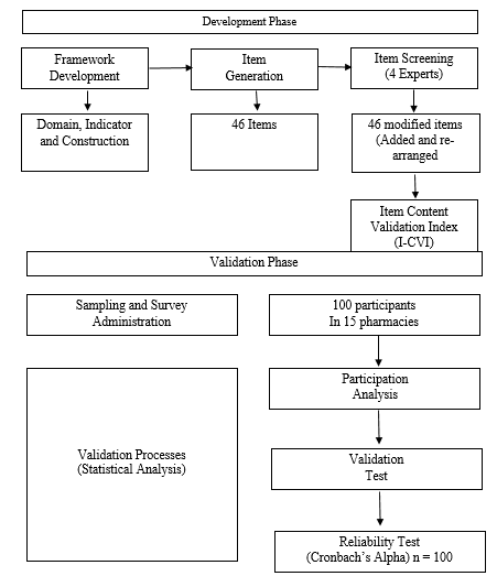 This research was carried out in Jakarta, Indonesia, between February and September 2024. It involved a design and development phase from February to May 2024, followed by a validation phase from June to September 2024. The ethics committee of the Faculty of Pharmacy at Andalas University granted ethical approval for the study. (Number: 55/UN.16.10.D.KEPK-FF/2024). All methods were conducted in accordance with the Declaration of Helsinki, and informed consent was obtained from all participants. This study was conducted in the design development and validation stages. In the design and development stage, question items were designed in a questionnaire and, in its development, referred to the research objectives so that the items were relevant so that the goals could be achieved. In this first stage, we designed a framework, created question items, selected relevant items, the validity of the question content, and determined the I-CVI by involving experts. The second stage is the validation stage; the question items were measured for validity using Cronbach's alpha analysis and reliability testing.